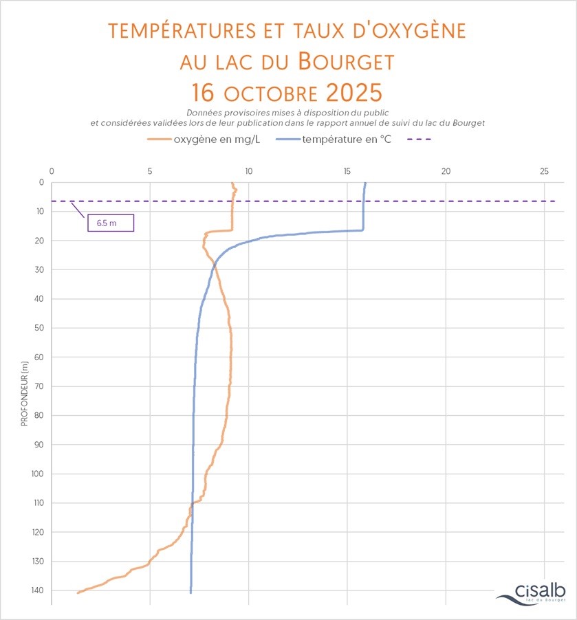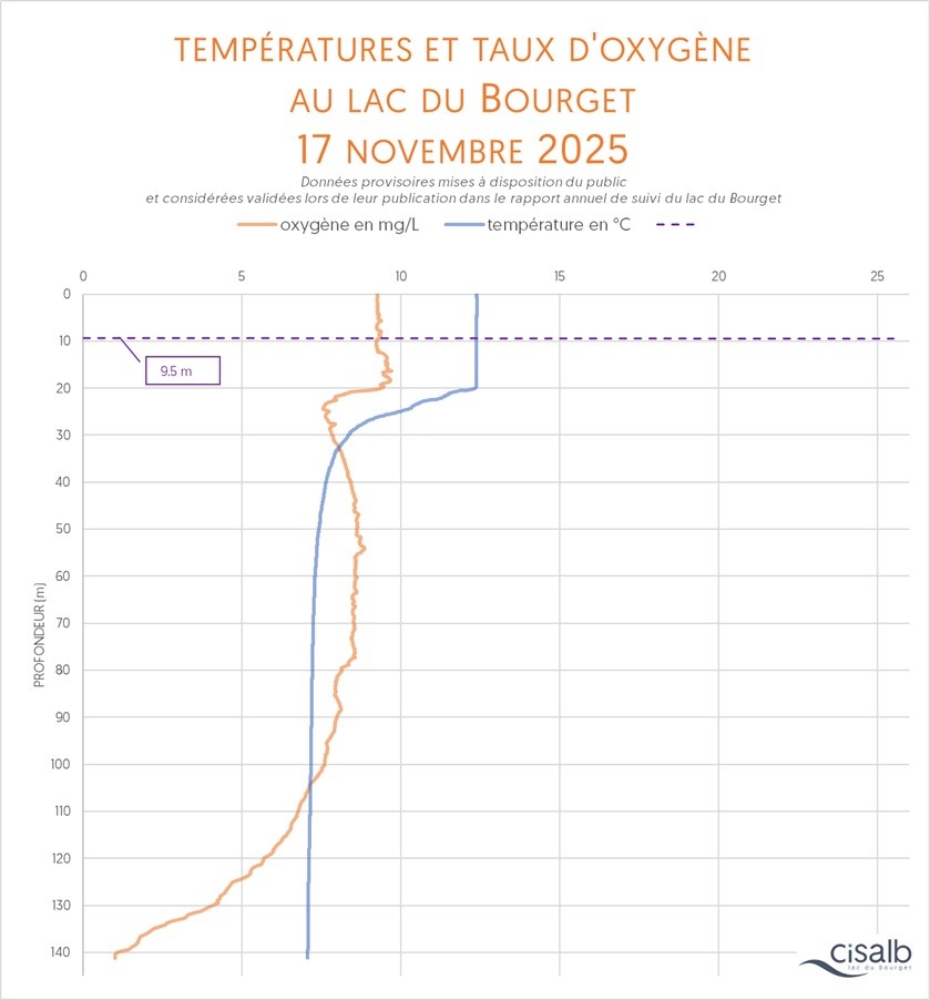 La température (en °C) de la colonne d'eau du lac dévoile plusieurs informations : sa situation par rapport au brassage de l'eau entre la surface et la profondeur (attendu chaque année), la mise en place de la thermocline et son évolution au fil du temps (véritable barrière invisible dans la colonne d'eau), les conditions de survie de la fune et de la flore, bref, c'est un paramètre essentiel pour témoigner de la vie biologique du plan d'eau.